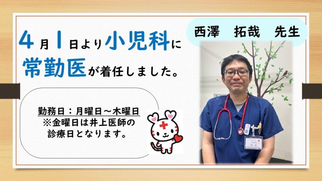 小児科外来、4月1日より常勤医の着任に伴い、月曜日から金曜日まで診察できます。